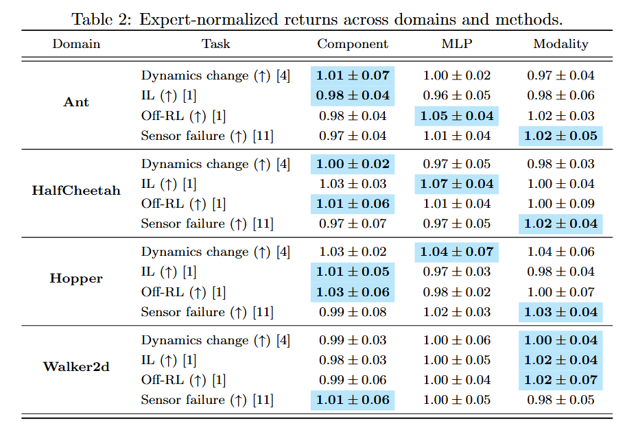 Render a grouped LaTeX table with two-level row headers (e.g., Domain and Task) and flat method columns (e.g., MLP, Modality, Component).